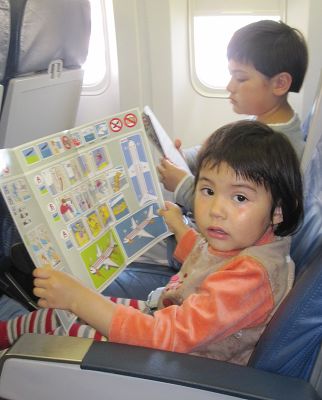 要出發旅行去囉!不過我們班機時間在傍晚,大哥已經頻頻打哈欠了。大哥研究飛機安全手冊,小妹當然也要和哥哥一樣,好好研究一番。