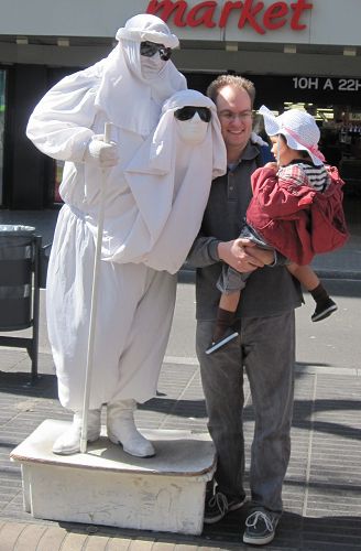 3/24/11 第二天,因為老公他娘沒特別想去哪裡,我們也還是沒計畫狀態,乾脆先到市中心Plaza Catalunya去晃晃,Luka和Leia追了一會兒鴿子,接著往觀光客聚集區La Rambla前進。〈有個方向感挺好的老公的好處,就是即使我偷懶沒研究地圖,也不怕一群人會在大街小巷中迷路,而且現在還多了個Luka幫忙研究地圖和記路,反而我老是會被自己兒子碎碎唸說我記錯路了!真是OO+XX......〉這裡的廣場大概比較少在清地板,因為滿廣場鴿子的結果,就是滿廣場的鳥糞,老公他娘拉著大家很快穿過廣場,因為鳥糞太多了。很奇怪,明明倫敦也是一堆鴿子啊,地板就沒這麼顯目的鳥大便,大概倫敦人比較勤快清地板。