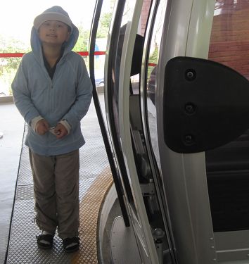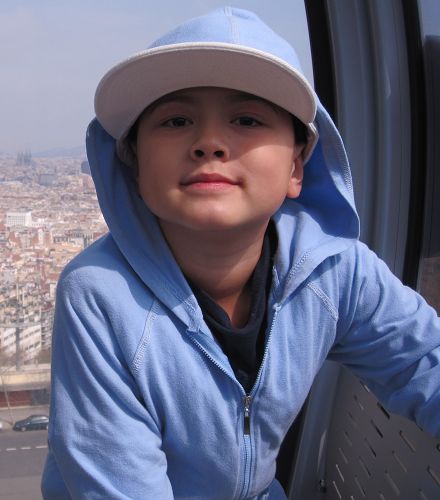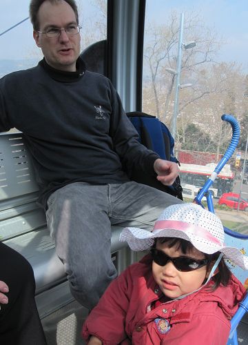 出門後,我們先搭地鐵到Parallel站,再直接轉搭Montjuïc funicular〈一種特別的上下山電車系統〉到最後一站,最後撘電纜車到山頂碉堡。下面右邊照片就是在電纜車門外,纜車就是一直慢慢動不會停,我們自己上車後,車門設定好時間自動關門。