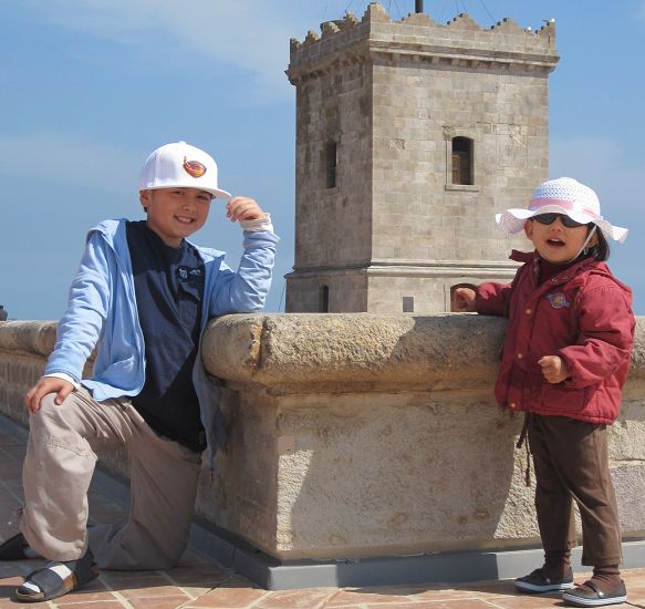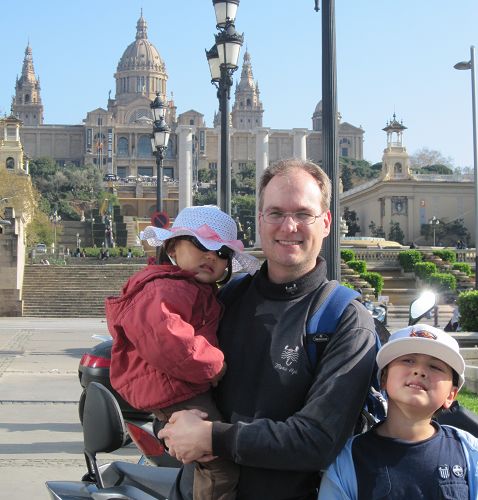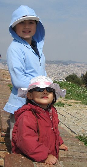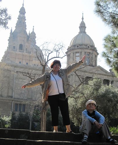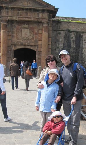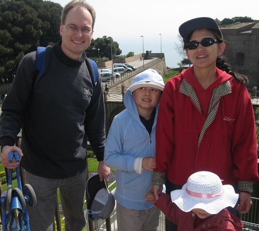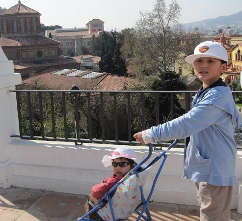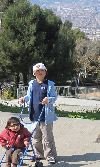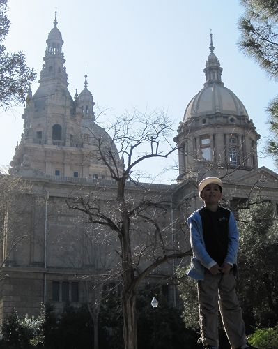 3/25/11 - 第三天的計畫是到Montjuïc這個小山丘。從地圖看起來,這裡就是一大片綠地,山坡各個大小公園相連,加上山頂的碉堡Fortress和山腳的美術館The Museu Nacional d'Art de Catalunya,看樣子我們就算在這裡耗上一天也看不完,等我爹娘來可以再來一次,於是就決定到那裡去,而且從山頂的碉堡開始。是說,等我們這位小姑娘睡醒,吃完早餐,一切準備就緒可以出門去,都已經十一點多了,還要在下午六點之前回公寓等老公他弟和女朋友,反正能走多遠就看多少吧。我們帶小朋友出門旅行的策略,一直是小朋友吃飽睡飽心情不錯最重要,不然他們耍起番來,什麼都不用談。其他有多少時間能晃多久就看多少,重點倒不是景點,而是我們全家一起在不同的地方,用不同的心情旅行,自己計畫安排行程自己找路,輕鬆自在隨幸,不用趕趕趕,順便看看當地人的生活方式。這是我們從來不參加旅行團的理由。
