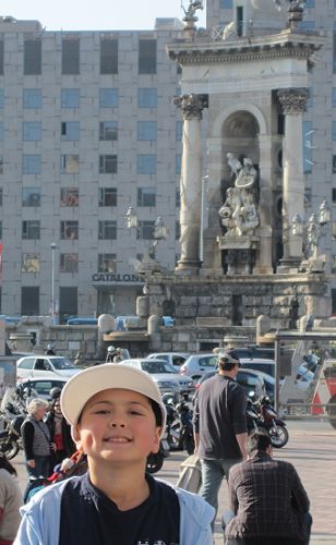 美術館再繼續往下走就是大噴泉Magic Fountain of Montjuïc (Font màgica de Montjuïc),十月到四月每個星期五和星期六的下午七點到八點半之間有燈光音樂水舞秀。不過今天要回公寓等人,無法看到水舞,決定我爸媽來時再來這裡,專程看水舞。大噴泉的對面就是Plaza d'Espanya,Luka背後的雕像圓環所在處。還有,巴塞隆納很多機車騎士,所以灰塵才這麼多?