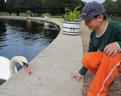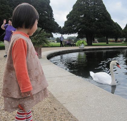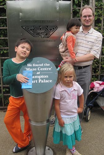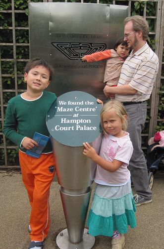 今天繼續往倫敦郊外跑。計畫是到搭火車大概一小時遠的Hampton Court Palace。Hampton Court Palace從亨利八世(Henry VIII)開始成為英國國王或女王的財產,由於亨利八世和他的歷任妻子們其中五任曾住在這裡,所以裡面有一些關於他把幾任妻子砍頭,和迎娶最後一任年輕妻子的故事。不過我們之所以來這裡,當然不是因為對創造英國國教的亨利八世有多大興趣,而是因為這裡有幾個很大的花園,然後其中一個花園裡有個迷宮花園!我們家大哥不但愛畫迷宮和解紙上迷宮,還喜歡親自走在迷宮裡,所以我們一看到這裡有迷宮花園,當然要來走一走囉!今天老公他大哥、Alex和Tracy仍然直接開車到這裡和我們會合,再繼續和我們混一天。三個小孩今天都已經混熟了,逛宮殿走迷宮玩得很高興。