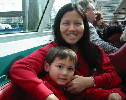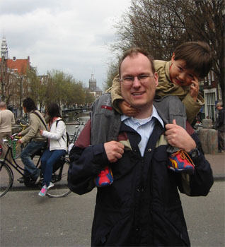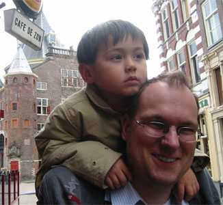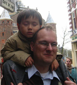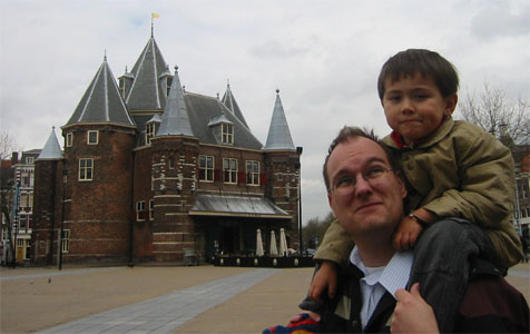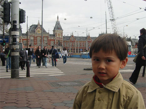 4/18/06 - 本來是今天一早的飛機回美國,Luka爹娘還因為一早五點就要起床,幾乎整晚都沒睡好,Luka也很合作地清晨五點就起床了。結果可能是剛好復活節假期之後第一天吧,往Amsterdam的高速公路大塞車,原本只要兩小時的車程,我們塞了四個半鐘頭,結果當然是趕不上飛機了,還好第二天的班機還有位子,於是我們處理好機位和當天晚上要待的旅館,搭免費巴士到機場旁的旅館check in,放好行李,雖然挺想倒頭大睡,可是一早起來都沒吃東西,肚子很餓,再加上平白無故多了一天假期,應該好好利用,於是就決定坐火車到Amsterdam市區覓食和逛逛。