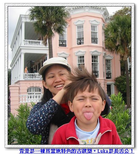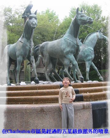 這次來到位於南卡州靠海的古城 Charleston,離我們家約六小時車程。Charleston是英國人最早移民來到這塊新大陸,登陸並試著定居下來的城市之一。雖然在美國是古城,其實也不過兩、三百年歷史,當然是無法和歐洲的古城比,不過這兒的房子和另一個鄰近古城 Savannah一樣挺有歐風,而且聽說這個城市的政府和人民對於保留古蹟不遺餘力,所以法律規定不能隨便拆舊房子、舊街道 〈街道表面的石頭壞了,一定要找到一模一樣的來修理,聽說還因為這樣,使得一間已經關門大吉,幾十年前供貨的石頭店重新開張,不過做完與其他石頭一模一樣的石頭後, 又重新關門大吉!〉只能維修,可是房子要是真的年久失修,有時候拆掉重蓋反而比修理還省錢省事,所以路上隨處可見明顯空著的破舊老房子,我們猜是屋主沒錢重新整修,又不能拆掉,只好另覓他處起新居。 連我們住的在市區的Hampton Inn,聽說也是舊倉庫改建成的,只是改建之後根本看不出是古蹟,不知道這樣做有啥意義?感覺好像太極端了。