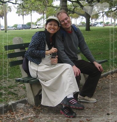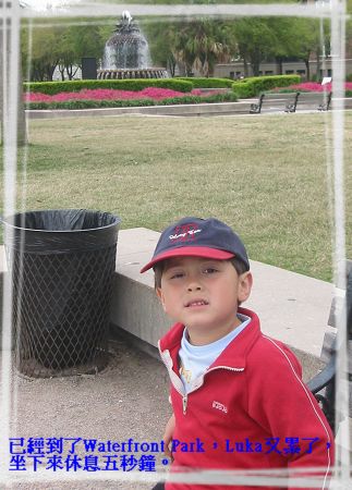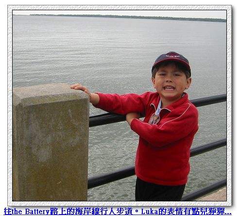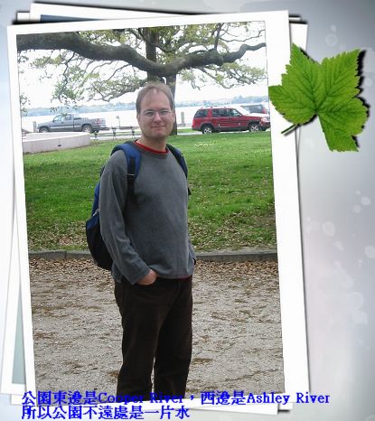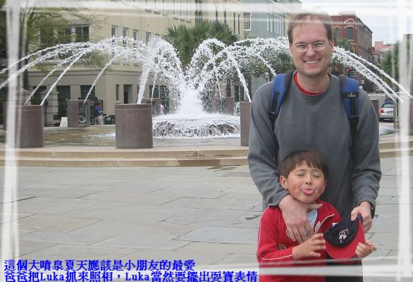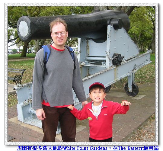 4/9/08 - 今天繼續昨天傍晚沒逛完的古城市區。看著地圖一路往南走,直到The Battery之前開始有沿著Cooper River河岸高起來的行人步道,一邊是河,一邊則是一排擁有當地建築特色的舊建築。一直走到最南端是個綠意盎然的公園,the White Point Gardens,公園的西邊有Ashley River跟Cooper River交會。走到公園時都已經中午了,表示我們已經走了兩個多小時,所以爹娘當然在充滿林蔭公園裡的長椅子坐下來休息,Luka則拿著照相機在公園裡四處跑、到處亂照相,一點也不累的樣子,完全不用休息。