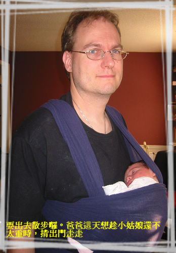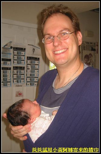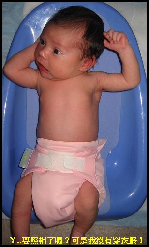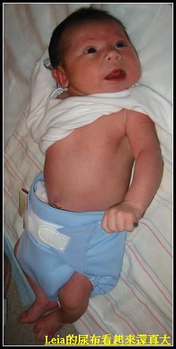 9/18/08 - 這次為了不要製造超級多的垃圾,Leia出生前媽媽研究了幾款不同的可洗尿布,最後決定要買這一款one size的,就是可以從出生一直穿到至少兩歲。本來媽媽也很懷疑新生兒和兩歲小朋友size差這麼多,怎麼可能穿得下,可是網路上用過的人的評價都是說沒問題,而且很舒服,於是決定試試。果然,尿布包在Leia屁股上雖然看起來很大,可是真的封得很好,如果沒有人為包歪的因素,絕對不會漏;一般丟棄式尿布最多五小時沒換就會太滿開始漏,可是這個整晚12個小時以上沒換都沒關係;然後表面很神奇地很乾爽,我們要是要出門讓Leia用丟棄式尿布,最多兩片之後她的屁股就紅通通,可是用這種尿布則不會。當然很大的缺點是要洗洗洗,所以換尿布時間比較長,尤其新生兒每天要大便五六次,要花很多時間和用掉不少水,不過水至少是自然資源,而且循環不息,丟棄式尿布則是過幾百年地球都消化不掉的東西,為了下一代的環境,希望這些時間花得還是值得啦。