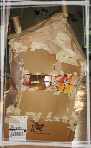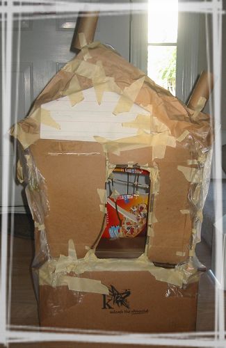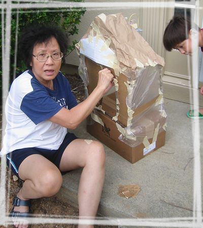 9/21/08 - Luka一直想用掉在院子裡的樹枝蓋個房子,已經想了很久。可是那個爹沒耐心窩在屋外太久,那個娘則是藝術天份缺缺,不知道可以怎麼蓋,也實在沒耐心在門前蹲半天,所以就一直找藉口拖延。這天爸爸終於起個頭,跟Luka一起找了些樹枝撐起四面牆的支架,然後就躲回電腦前,Luka當然唉著要媽媽繼續幫忙,媽媽硬著頭皮繼續做了屋頂的支架,接著當然就由超級有耐心和頗具藝術天份的阿媽接手。阿媽很專心地花了一上午的時間,廢物利用地蓋好這棟房子。至於Luka,則是負責在一旁撿更多樹枝,和拼命撕膠帶拼命往房子貼。