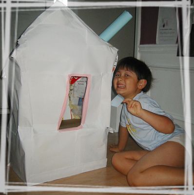 第二天Luka覺得棕色的房子,再加上貼得亂七八糟的膠帶很不好看,於是開始要把牆壁變白色好美化房子,可是要把這一棟凹凸不平的房屋牆壁變白也不是一件簡單的事,於是阿媽又花了一天,很有耐心地把房屋週遭漂亮地貼上白紙,還把門和窗戶貼上粉紅色框,這棟房子果然好看很多!奇怪,我娘的耐心美德怎麼都沒有傳給我們呢?!