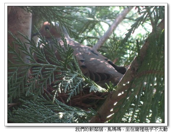 大概一星期前吧,我們發現有兩隻鳥經常在主臥房浴室窗戶外的大樹上留連徘徊,經過後來幾天較詳細的觀察,發現有一隻(我猜是公鳥)經常嘴巴叼著稻草回來給留守那隻(我猜是母鳥),幾天後母鳥留守處的樹枝上,一個鳥窩慢慢成型,接著這隻母鳥就坐進窩裡,然後就一直坐著,從來沒見她起來過,於是我猜她坐的地方下應該有幾顆蛋,不過因為母鳥老是坐著,我們看不到底下是不是真的有蛋。於是這兩天早上起床刷牙,和白天蹲廁所時,我們都會注意一下新鄰居的動靜,尤其 Leia都會一邊不停「啾啾」叫,一邊指著母鳥,要我們抱她站到高高的浴缸邊上看窗外的鳥媽媽;Luka則總是白目地故意製造一堆噪音。然後自從窩做好後,公鳥就再也不見蹤影,不知道是找食物去,還是已經完成使命,跑了?!不過我覺得鳥媽媽真是太厲害了,真的幾乎沒在動,而且我很疑惑她要吃甚麼啊?因為不管何時看她,她就是一直坐著,連站起來都沒,更別說離開窩了,難道鳥爸爸其實有常常送食物來,只是我們沒看到?到目前為止,鳥媽媽已經這樣坐著不太動過了大概五天。我們好期待看到幾隻鳥寶寶終於探頭出來的一天,不知道這隻鳥媽媽會孵蛋孵多久啊?!