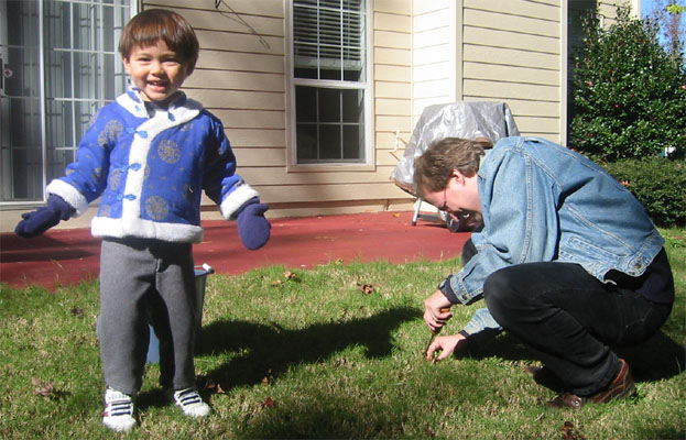 昨天星期天,艷陽高照的好日子,望著滿後院到處滋生的雜草,爸爸終於看不下去了〈倒是媽媽依然覺得還好嘛〉,雖然屋外氣溫不到攝氏十度,還是決定要捲起袖子拔草去,Luka當然二話不說,非常快樂地加入幫忙的行列!Luka都出門了,媽媽只好也跟著在凜冽的寒風中與Luka追趕跑跳碰!