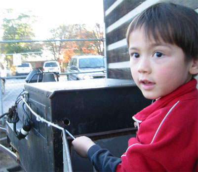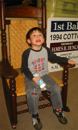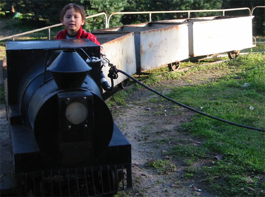 才在河邊公園晃不到半小時,沒睡午覺的少爺決定他的腳走得很累,一直要巴到媽媽身上抱抱。就算爹娘輪流抱,抬著18公斤的重物散步終究不是這麼浪漫悠閒,於是我們決定先到遊客中心阿媽和旅遊書上都有推薦的當地一家有趣、專賣手工飾品、聖誕擺飾的店逛,因為Luka爹滿心希望能找到一種德國聖誕手工藝品German Pyramid Christmas Carousels。逛了半小時,很失望地發現這家店並沒有那麼特別,所以當然也沒有爸爸要的東西。倒是Luka很快樂地發現商店旁邊的院子裡,竟然有火車可以坐!少爺馬上不累了,急著拉媽媽趕快逛完一圈,趕快到院子去坐火車,還顧客自行控制火車開關呢!因為還有別的小朋友要坐,而且大家都想要坐火車頭、拉前面的鐘,所以Luka和另外在等的一個小朋友,輪流坐了三回合,才終於不太甘願地被媽媽帶走。
