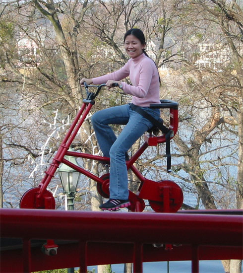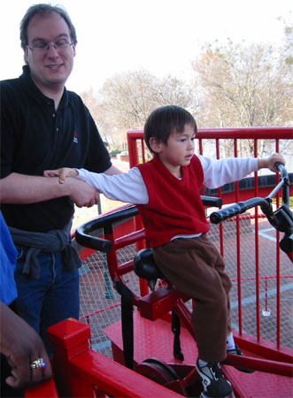 昨天下午我們明明看到有爸爸抱女兒騎這個空中腳踏車一圈,所以Luka才會很興奮地說著他也要爸爸抱著騎一圈,工作人員鎖一打開,Luka馬上迫不及待地爬上腳踏車。可是幫我們開鎖的那個工作人員比較沒彈性,說照規定他不可以讓我們這樣子,於是Luka只好很失望地下來,好像都快哭了,靜靜地站在旁邊看爸媽各騎一圈。