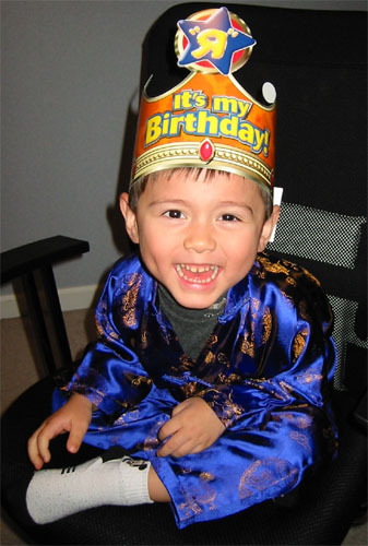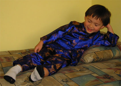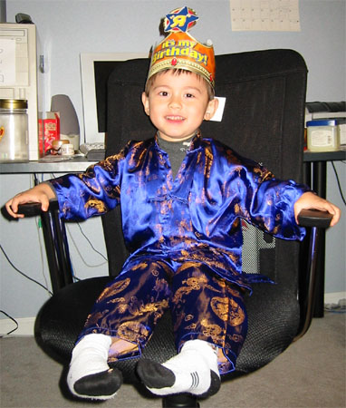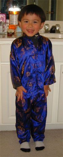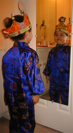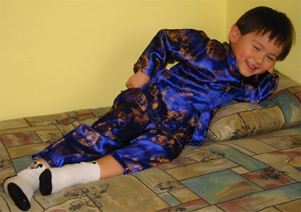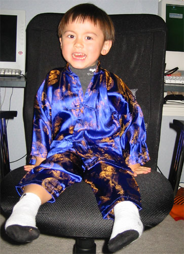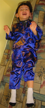 這一天在跟Luka玩坐火車出差的遊戲,忘記為什麼Luka突然提到國王了,反正媽媽就想到這一套爺爺在大陸買的貴貴絲綢中國裝,根本還沒機會穿,於是就給Luka換上,讓Luka當當小皇帝!反正媽媽也搞不清楚皇帝和國王有啥大不同,Luka更是不知道了。可是穿上後才發現,Luka明年一定穿不下了!唉,給小朋友買貴貴的衣服真是浪費啊!