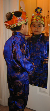 Luka還真是愛漂亮,被媽媽讚了幾句這衣服上面有龍,是專門給國王穿的超級漂亮衣服,Luka穿上馬上變成超級漂亮的小皇帝,要好好照幾張像之後,愈來愈不愛照相的他馬上很合作地擺出各種姿勢讓媽媽照相!