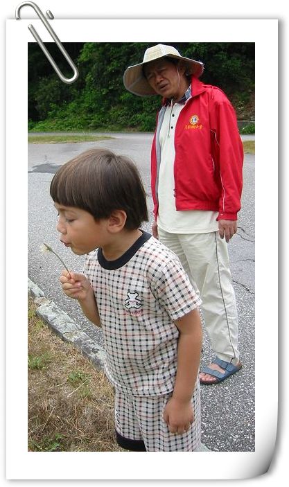 我們就走錯叉路,差點又離開山區,還好在路邊可以賞風景處下來問路,問完順便走走看看。爺爺看到一大片像蒲公英的野草,摘一朵來吹,Luka馬上有樣學樣,也吹得很起勁