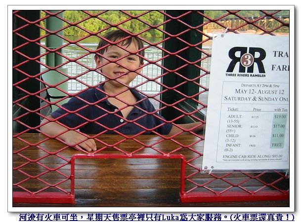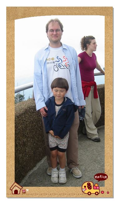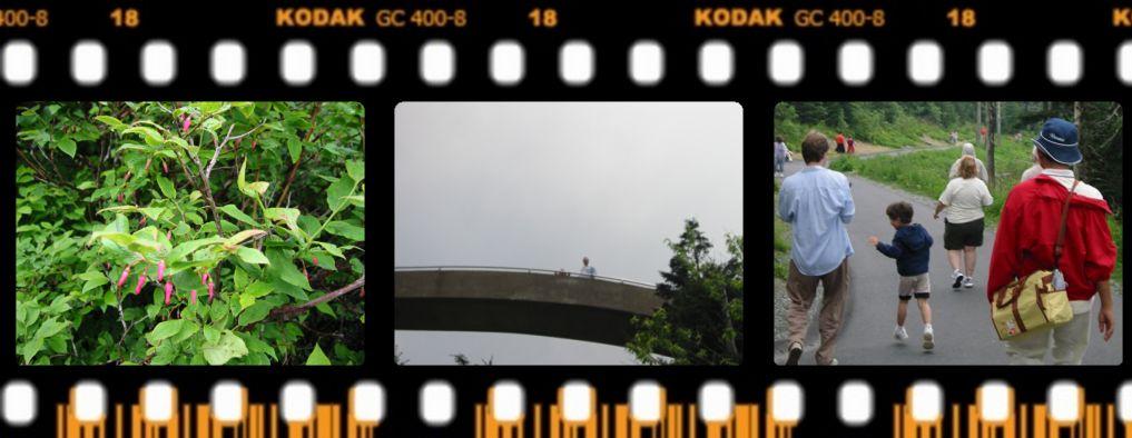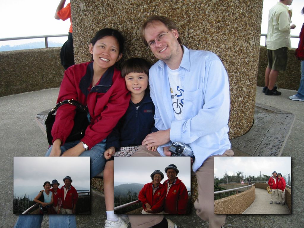 接著來到國家公園裡的一個景點,Clingman's Dome。沿著Luka爹背後蜿蜒的小路一路往上爬,Luka和爸爸一路快跑,一路領先,爺爺和媽媽陪阿媽慢慢走。最後經過懸空蜿蜒的天橋,就來到高高的涼亭平台。山上真的很涼快,我們到的時候還霧茫茫的,果然是避陽的好地方。在高台上吹吹風、照照相、看看山景,沒耐心的Luka就等不及要往下衝了!Luka一整路跳上衝下,精力充沛,嘴巴還從沒停過,卻一點兒也不喊累!真是難為了他爹。果然當天晚上Luka爹背又不舒服了,不知是因為被兒子拉著衝來衝去?還是長途開車?