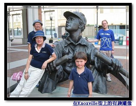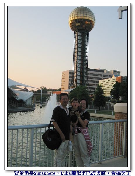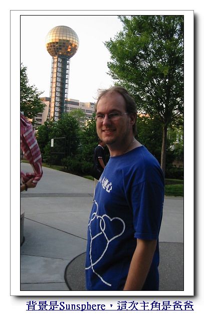 回程計畫順路去Knoxville晃晃。Knoxville有田納西河的源頭流過,所以市區有條長長的waterfront。而由於1982年的世界博覽會場在這裡,當時蓋的Sunsphere就成了Knoxville高高明顯的地標。這天下午兩點就到Knoxville了,不過太陽正大,於是先到旅館去喝茶休息。等四、五點再出門,反正夏天不到八、九點,太陽不下山的。