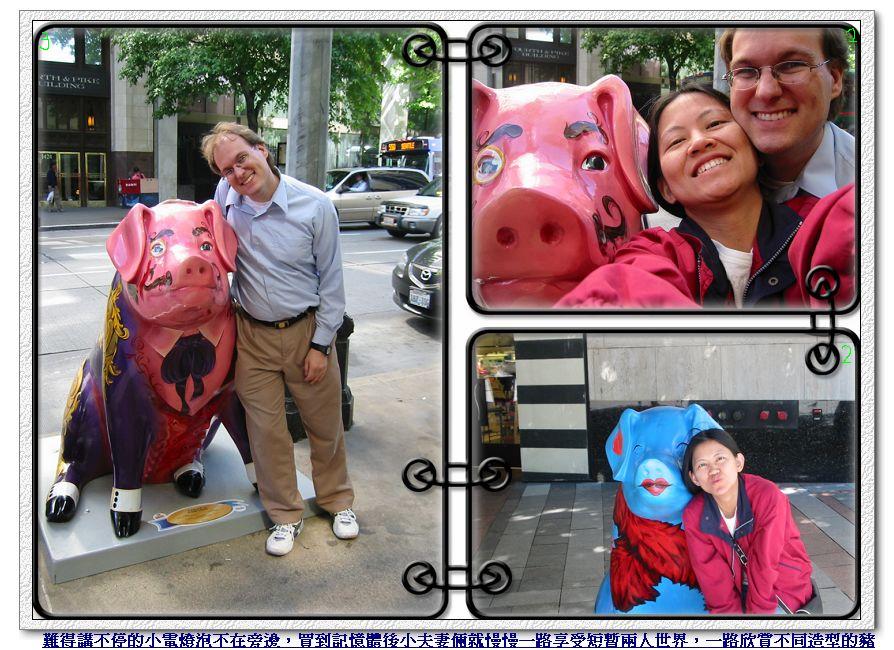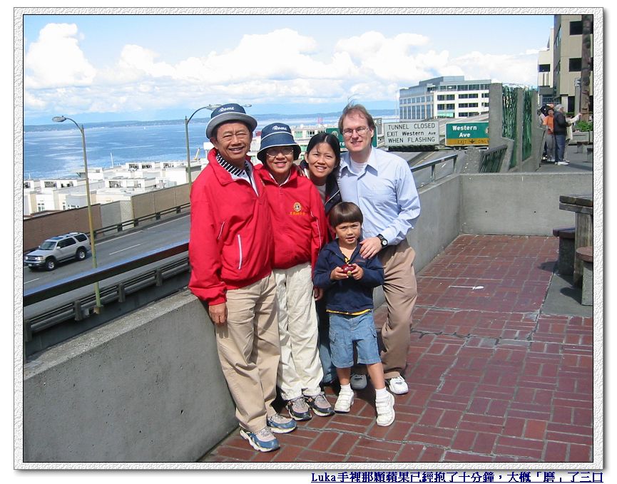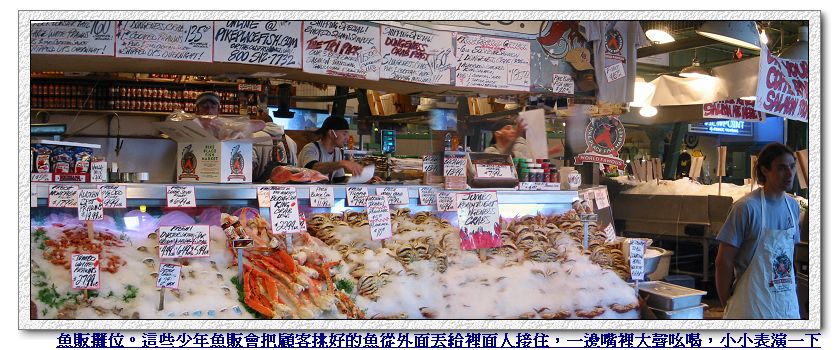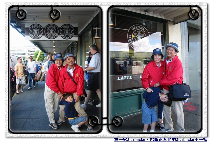 6/25/2007 - 這一天的行程當然是先到西雅圖市區晃晃,首站當然是遊客朝聖地 - 有第一家星巴克Starbucks的Pike Market。西雅圖市區有一部分是免費公車區,只要是在這區域,隨便想上下公車幾次都是免費。本來想說一路從旅館走到免費公車區,看到有公車就跳上去,省點腳力,沒想到好像才沒走多久,Pike Market竟然已經到了!第一次在美國看到這樣子的市場,怎樣子的市場....嗯,就是一排長長的走廊,一邊有相鄰的攤子,賣各式海鮮、農產品〈沒看到賣肉〉、藝術品、衣帽飾品、糕點食物,有一部分甚至有兩樓,攤位間還夾雜著小餐廳和Cafe,有那間「西雅圖夜未眠」裡有出現的小餐廳,餐廳玻璃上有Tom Hanks的照片,所以很好找。很奇怪的是,雖然這兒有賣海鮮蔬果,可是竟然沒有魚腥味,也很明亮乾淨,不知道怎麼辦到的?!街道的另一邊有很多小商店,賣的東西跟對街攤位們差不多,不過有一家常常排隊排到店門外的咖啡店 - 沒錯,就是星巴克的起源地!其實我們也不是真的這麼喜歡Starbucks的咖啡,Luka娘在亞特蘭大還沒光顧過Starbucks呢,而且西雅圖街上走五步就一家咖啡店,這家Starbucks始祖店內還根本沒有可以坐下來休息的位子,大家都是買了就跑。不過既然來了,我們還是入境隨俗去排個隊,點四杯咖啡,順便跟Starbucks元老級招牌照個相,盡盡旅客的責任。