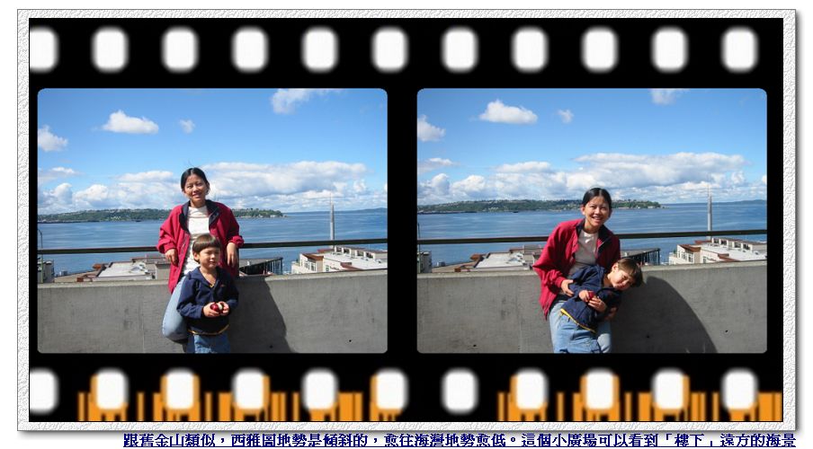 Mall,不是想逛街,而是要搭Monorail回旅館去。西雅圖西邊靠海,東西向的路基本上都有很大的坡度,向海邊走是下坡,我們要從海岸往市區走,當然是挺陡的上坡,而且很少有公車跑東西向,大部分都是南北向。所以雖然知道阿媽大概快要「鐵腿」了,還是只能鼓勵她加油爬上坡。還好只需要從2nd