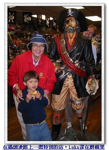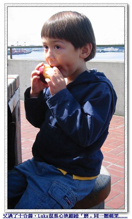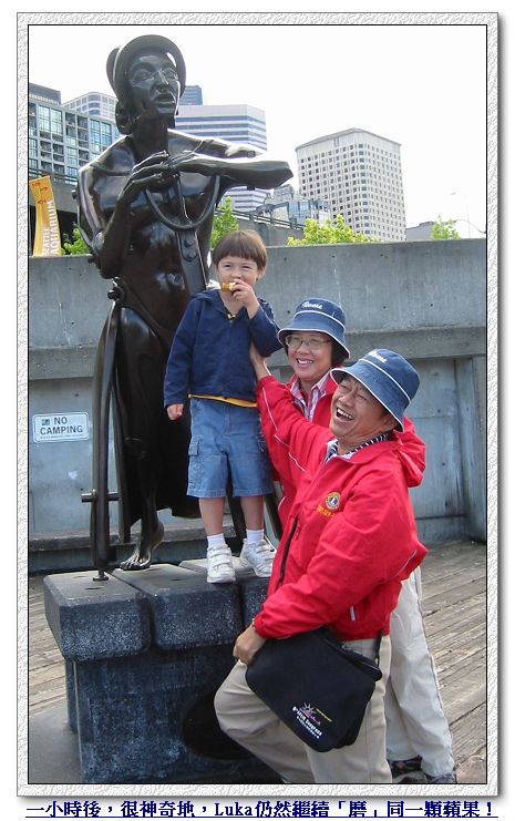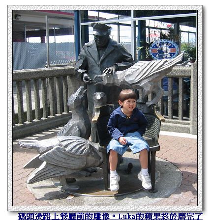 逛完市場、喝完咖啡,我們也累了,在市場旁一處有雕像、印地安人圖騰、很多可以坐下來野餐的桌椅、和明媚海景的小廣場坐下來,休息吃蘋果欣賞風景。 真的是「吃蘋果」!為了等Luka終於「磨」完那顆蘋果,我們休息了一個多小時!他就這樣慢慢地用他的兩顆大門牙,慢慢地、一點一滴地磨,每磨完一口,還要在嘴裡細細吸允品味剛磨下來的蘋果汁......Luka娘看得真不知該哭還是笑!