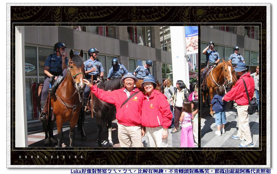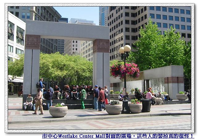 Westlake Center週邊街上有各式各樣的商店,大概叫得出名字的連鎖店這裡都有,是很熱鬧的逛街購物區。不過真正吸引我注意的是Westlake Center對面的一個廣場,因為有好多奇裝異服、髮型髮色古怪的年輕人聚集在這兒....〈唉,Luka娘真的老了,開始覺得現在年輕人的裝扮真是不三不四,還偷偷跟Luka爹說, 希望以後Luka不會打扮成這樣,還全身亂穿洞,不然我可能會昏倒....又在亂想了!〉然後我們看到四個警察騎在四匹大馬上一字排開,人手一杯咖啡,雖然應該是在休息喝涼,可是顯目地好像是在幫咖啡店拍廣告!Luka一開始不太敢靠近,觀望很久才終於上前去看看,不過還是堅持不肯摸摸馬或是跟馬照張相。