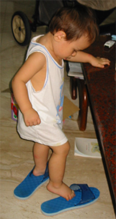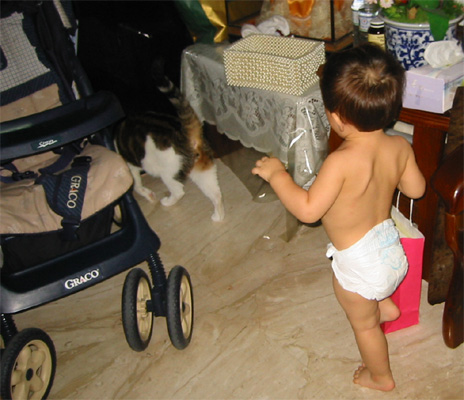 9/2/03 - Luka不喜歡陌生人碰他,於是以腳先做第一類接觸 9/3/03 - 嗯,大人都穿這東西走來走去,我也來試試!不太成功.....