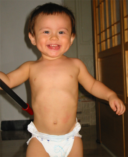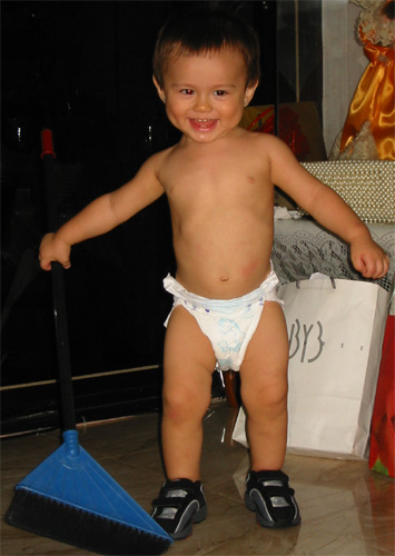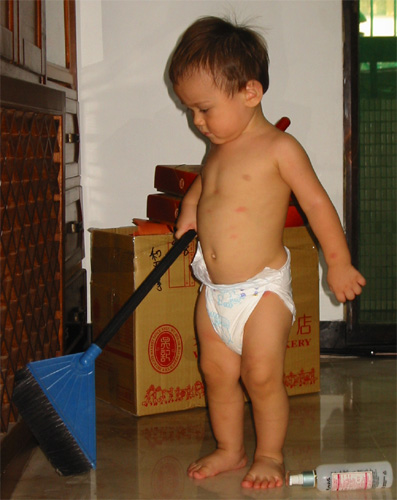 9/8/03 - 嗯,我看阿媽是這樣掃地的。Luka真的是非常雞婆!掃地、擦地板、擦桌子、用吸塵器吸地板,他統統包辦!只是很不可靠就是了