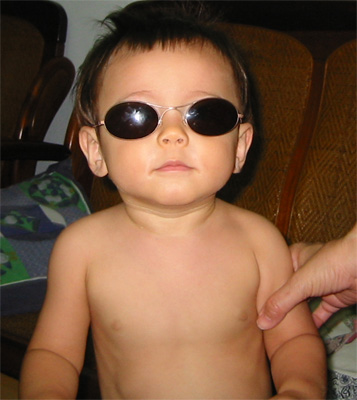 9/5/03 - 這又是什麼啊?!不太舒服ㄋㄟ˙ 阿公給Luka的墨鏡