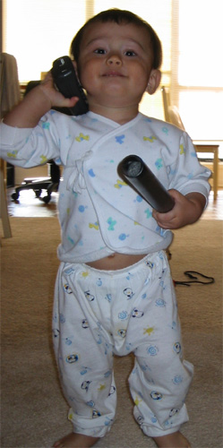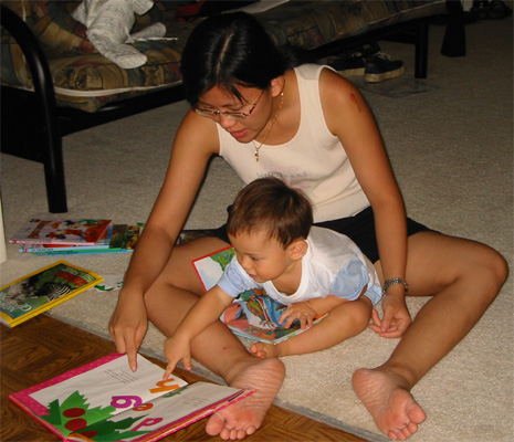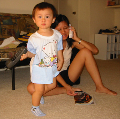 9/28/03 - 媽媽在講電話,Luka也會講電話! Luka看書很不專心,有點兒『吃碗內,看碗外』