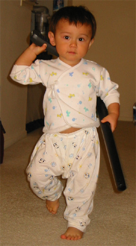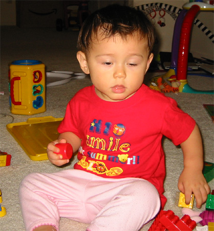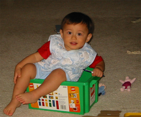 10/9/03 - Luka剛睡醒的樣子。這是碩果僅存的一件pinky褲褲 Luka喜歡故意倒退走,然後坐進放積木的箱子