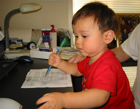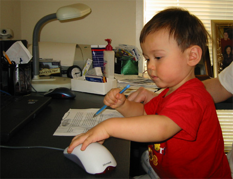 10/19/03 - Luka喜歡拿筆到處畫,家裡的牆壁不少地方都有Luka的傑作!不過滑鼠也很吸引人......最後決定兩個都要!