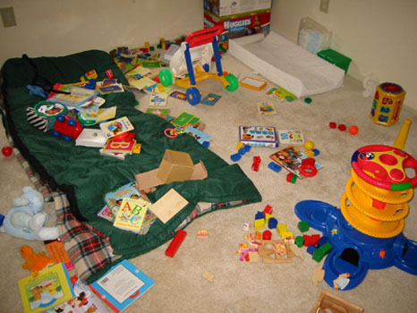 1/08/04 - 才五分鐘不到,Luka的房間已經亂七八糟了,至於罪魁禍首,則正在一旁很專注地研究照相機,一付不干我事的樣子。