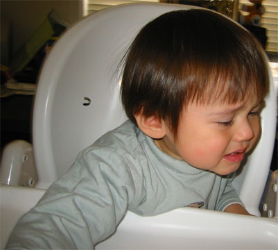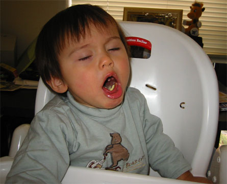 1/08/04 - 又一邊吃午餐,一邊打哈欠了,然後乾脆就趴下來睡著,要把他吵醒吃飯就擺這付臭臉。