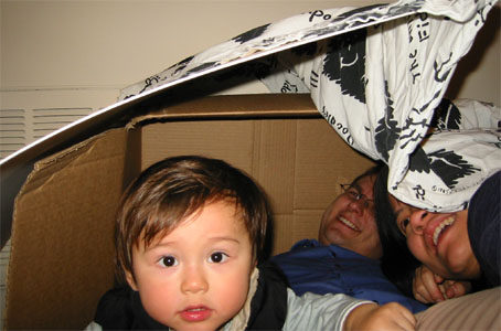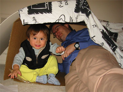 1/09/04 - 爸爸發明的玩法 - 跟Luka一起擠進箱子裡...嗯,少了媽媽...媽媽趕快進來!