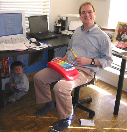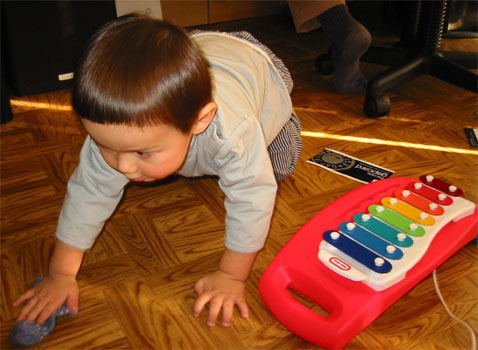 1/11/04 - 爸爸提議要買的玩具,不過好像變成爸爸的玩具了!Luka則正努力要把襪子脫掉,要做什麼呢?擦地板囉!真是方便的抹布啊