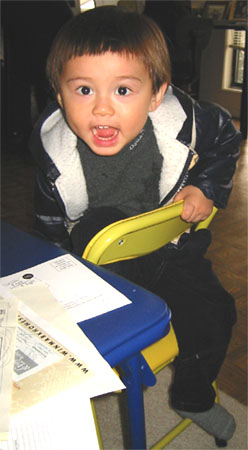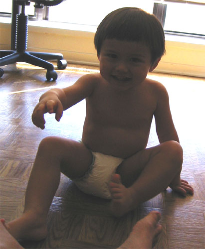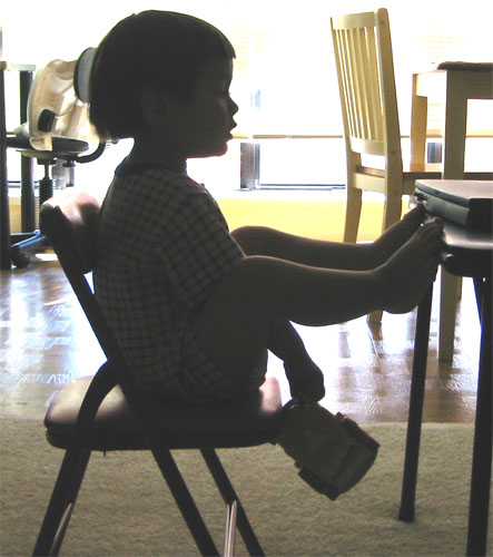 3/7/04 - Luka是長腿弟弟,腳跨在桌子上還挺有板有眼的! 天氣開始回暖,Luka也開始露出小肚肚了