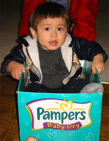 2/27/04 - 推雪橇好累!趕快趁機休息 媽媽中場休息,Luka沒事做,來爬椅子吧 好了,下一回合開始!可憐的媽媽......