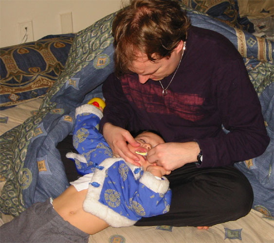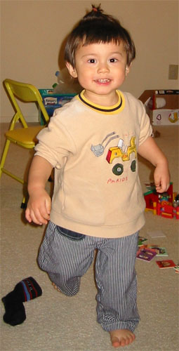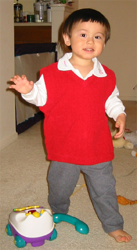 2/28/04 - 哈囉,Luka是不是小帥帥?! Luka已經對刷牙失去新鮮感,所以每天早上看到牙刷就馬上逃,要爸爸或媽媽抓著刷牙
