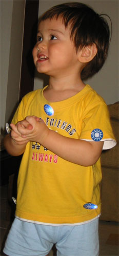 3/26/04 - 雖然Luka還分不清楚藍綠,卻很喜歡閃閃發亮的徽章,都已經戴了五個了還嫌不夠!