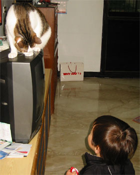 3/26/04 - 先互相對視,知己知彼,百戰百勝              3/29/04 - Luka開始露出侵略本性,咪咪只好躲高高的