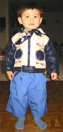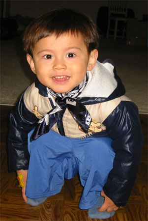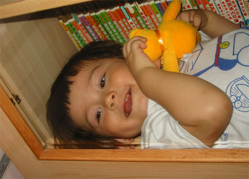 3/28/04 - Luka開始喜歡躲進櫃子裡、被窩裡玩躲貓貓,瞧他一付得意樣