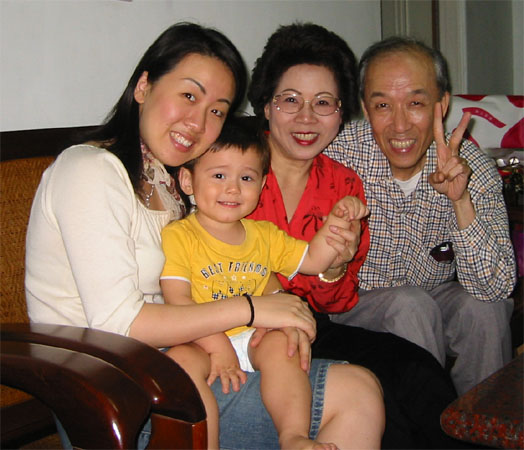 4/3/04 - 點名要來看Luka的鄰居阿姨家人。Luka可合作的很,擺足架式讓大家照相照個過癮,還都笑咪咪的呢!