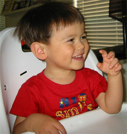 4/14/04 - Luka愛漂漂,看阿媽綁絲巾,Luka也要                                                                            笑得好開心