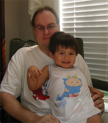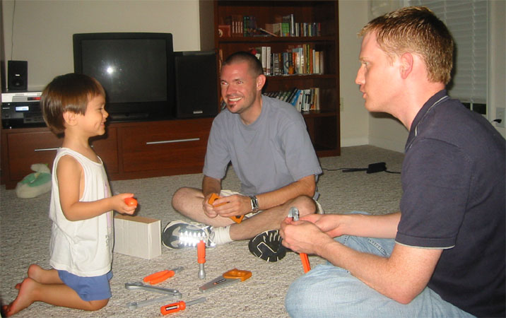 7/25/04 - 這是爸爸的同事Rob和他的partner,Luka照樣是人來瘋,跟兩個叔叔玩得很高興