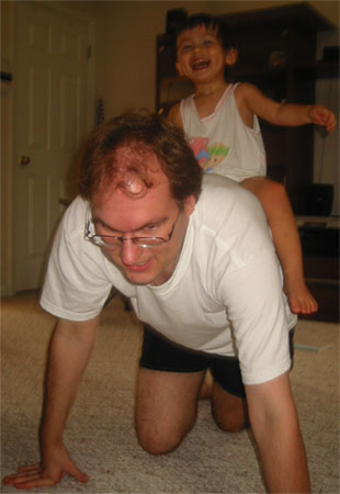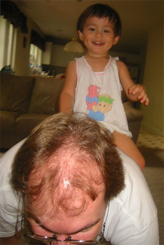 7/29/04 - Luka正高興地騎在爸爸背上〈爸爸自言自語:我頭頂的頭髮愈來愈少了......媽媽:沒關係啦,十個禿頭九個富,而且反正我比你矮,看不到啦〉