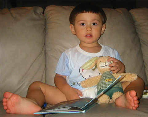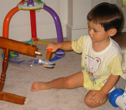 8/8/04 - Luka跟兔兔一起看書。...沒錯,Luka又被媽媽抓來剪頭髮了 8/13/04 - 爸爸在組裝Luka的新床頭,Luka也拿著他的專用槌子幫忙