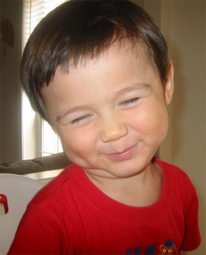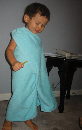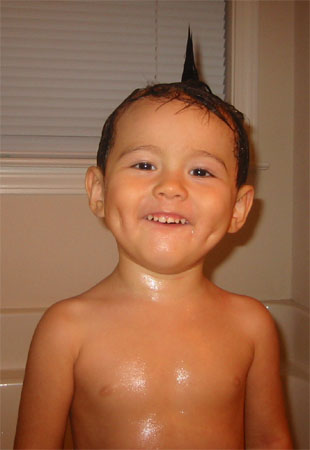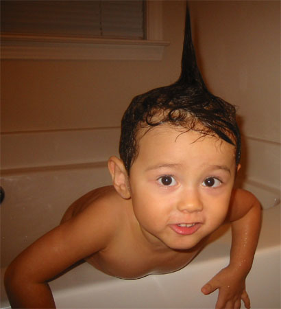 8/15/04 - Luka只有洗澡時才做得出來的沖天砲髮型,很酷!看樣子Luka也挺樂的