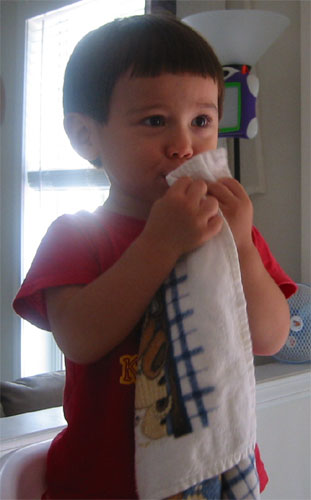 8/23/04 - 那天吃午飯時,Luka又開始很三八! 吃完飯了擦擦嘴。Luka式擦嘴法是一邊拿毛巾拍嘴,一邊嘴巴也不停ㄆㄨㄆㄨㄆㄨ,