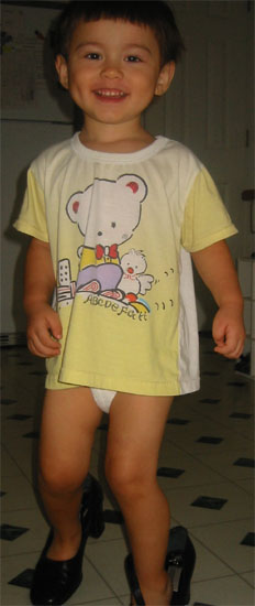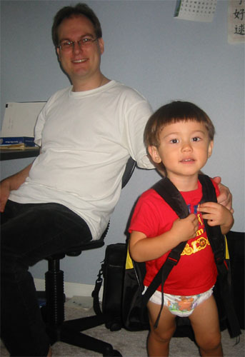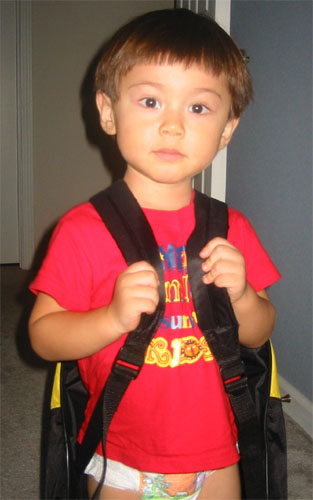 9/8/04 - 媽媽忙著打包去巴黎、德國的行李,Luka則忙著幫媽媽重新打包,然後迫不及待地背上背包,要出發囉!