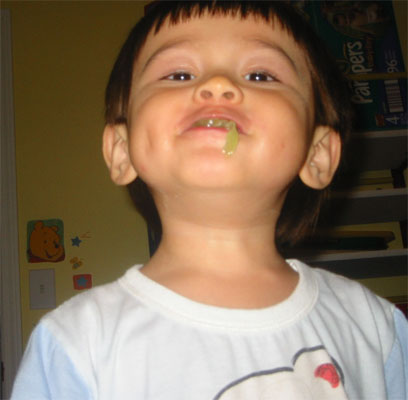 9/27/04 - 這天吃完晚餐,Luka看媽媽拿葡萄吃,就也想學,媽媽就讓Luka自己拿了一顆放進嘴裡,結果Luka才咬了一口就後悔了,一直想要把葡萄吐出來,當然被媽媽阻止了,因為那可是Luka自己要吃的!於是Luka把葡萄含在嘴裡含了半小時!還千方百計想趁媽媽不注意偷吐出來